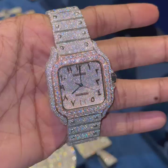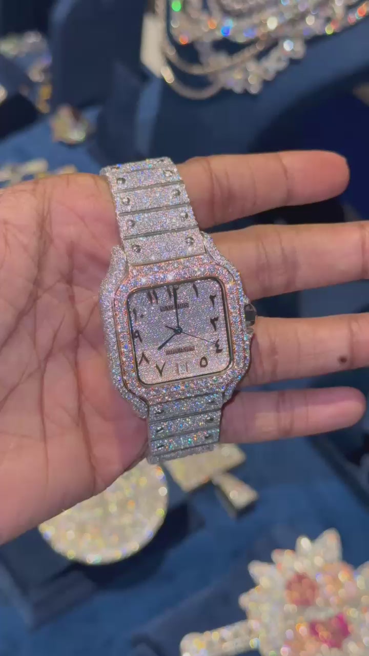 The Arabian Frost is a singular creation — a fully flooded Santos-style timepiece featuring a rare Arabic numeral dial, hand-set from bezel to bracelet with high-clarity stones. Every surface explodes with brilliance, catching light from every angle and transforming the room when you arrive. It does not compete; it dominates.