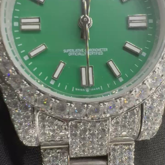 a fully iced custom timepiece built around a deep green dial that hits like polished gemstone.