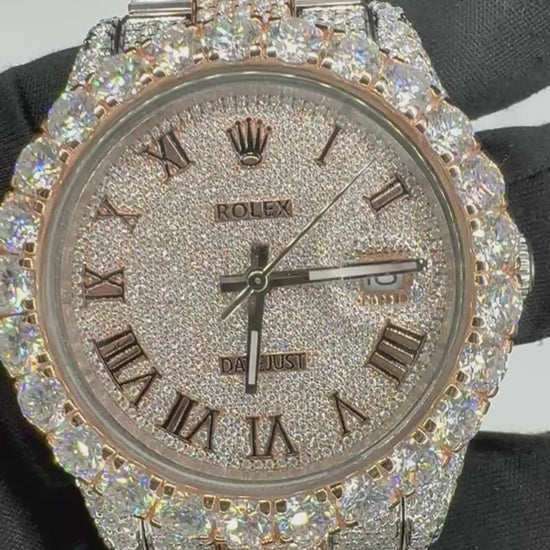 The dial is flooded in pavé stones, accented with rose gold Roman numerals and matching rose center links — a bold contrast between king’s metal and pure ice.