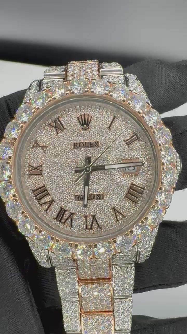 Fully iced from bezel to bracelet, this custom Rolex Datejust is set with precision-cut stones that explode under light. The bezel features oversized brilliant cuts with a deep VVS sparkle, giving the Emperor a glow that dominates any room.