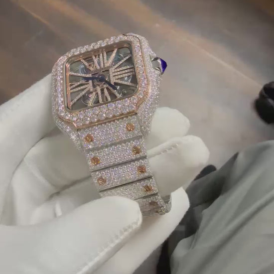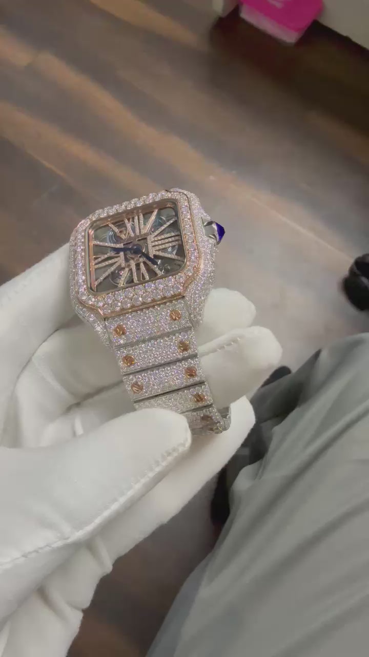 This exclusive one-of-one iced timepiece features a full pavé diamond setting from bezel to bracelet, with a rose-gold skeleton dial that reveals the heartbeat of the watch beneath. Every angle catches the light — from the squared bezel to the precision-cut stones cascading across the band.